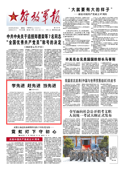 在中國共產(chǎn)黨97華誕到來之際,黨中央決定,追授鄭德榮等7名同志“全國優(yōu)秀共產(chǎn)黨員”稱號。這體現(xiàn)了以習(xí)近平同志為核心的黨中央對先進模范人物的高度重視,是對全黨同志的巨大鼓舞,必將激勵和引導(dǎo)廣大黨員干部不忘初心、牢記使命,見賢思齊、銳意進取,努力創(chuàng)造無愧于時代、無愧于人民、無愧于歷史的業(yè)績。請關(guān)注今日出版的《解放軍報》發(fā)表的評論文章——