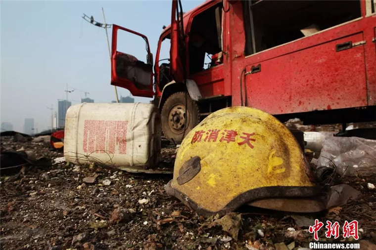 2015年8月15日,天津爆炸事故,現(xiàn)場(chǎng)一片狼藉,消防員的帽子散落在地上。