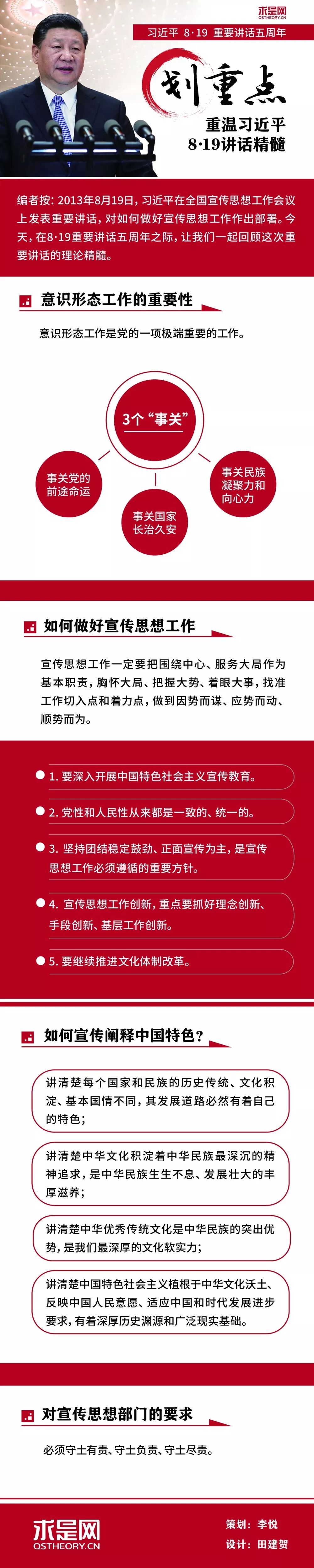 【“學(xué)習(xí)筆記”按】2013年8月19日,習(xí)近平在全國宣傳思想工作會(huì)議上發(fā)表重要講話,對如何做好宣傳思想工作作出部署。今天,在8·19重要講話五周年之際,讓我們一起回顧這次重要講話的理論精髓。