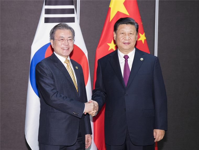 習(xí)近平指出,過去一年,我同總統(tǒng)先生達(dá)成的各項(xiàng)共識(shí)正得到有效落實(shí),兩國(guó)關(guān)系穩(wěn)步改善和發(fā)展。我們要不斷深化中韓戰(zhàn)略合作伙伴關(guān)系,共同為促進(jìn)地區(qū)持久和平和繁榮作出積極貢獻(xiàn)。雙方要繼續(xù)發(fā)揮好高層引領(lǐng)作用,尊重彼此核心利益和重大關(guān)切,加強(qiáng)溝通,建立和鞏固互信,繼續(xù)妥善處理好敏感問題。要重點(diǎn)推進(jìn)共建“一帶一路”,加快兩國(guó)自由貿(mào)易協(xié)定第二階段談判,推動(dòng)雙邊互利合作優(yōu)化升級(jí)。要加強(qiáng)在亞太經(jīng)合組織、二十國(guó)集團(tuán)、中日韓等多邊框架內(nèi)協(xié)調(diào)和合作。