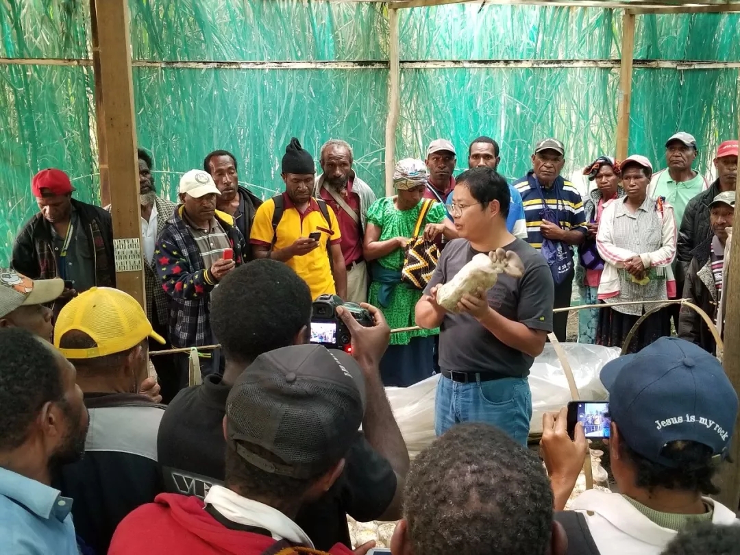 2018年9月4日,在巴布亞新幾內(nèi)亞?wèn)|高地省戈羅卡市中國(guó)福建省援巴新菌草與旱稻技術(shù)合作項(xiàng)目基地,項(xiàng)目組組長(zhǎng)林應(yīng)興向當(dāng)?shù)孛癖娭v解菌草種植技術(shù)。(新華社記者莫華英攝)