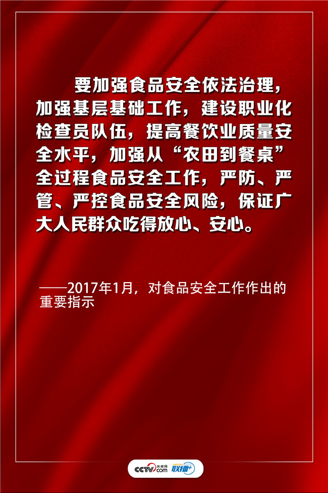 2017年1月,習(xí)近平在河北張家口考察嬰兒乳品生產(chǎn)企業(yè)時強(qiáng)調(diào),食品安全關(guān)系人民身體健康和生命安全,必須堅持最嚴(yán)謹(jǐn)?shù)臉?biāo)準(zhǔn)、最嚴(yán)格的監(jiān)管、最嚴(yán)厲的處罰、最嚴(yán)肅的問責(zé),切實(shí)提高監(jiān)管能力和水平。