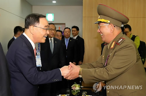 左為韓國總理鄭烘原,右為朝鮮人民軍總政治局局長黃炳誓。(韓聯(lián)社圖)