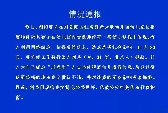 據(jù)@平安朝陽(yáng) 發(fā)布的通報(bào),11月23日,警方經(jīng)工作將行為人劉某(女,31歲,北京人)抓獲。該人對(duì)自己編造“老虎團(tuán)”人員集體猥褻幼兒虛假信息,后通過(guò)微信群傳播的違法事實(shí)供認(rèn)不諱,并對(duì)造成的不良影響深表悔恨。目前,劉某已被公安機(jī)關(guān)依法行政拘留。