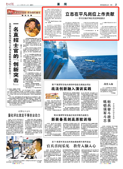 “我只是盡了一個(gè)民兵的基本義務(wù)”,樸實(shí)無華的言語,折射出王繼才這位守島老兵最真摯的國防情懷和最無私的奉獻(xiàn)精神。今年是我在航模操縱崗位上戰(zhàn)斗的第19個(gè)年頭,我要以王繼才同志為榜樣,不忘初心、默默堅(jiān)守,做到“在崗一分鐘,干好六十秒”,用實(shí)際行動(dòng)向王繼才同志學(xué)習(xí)。