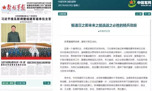 黨中央、中央軍委和習(xí)主席決定,全軍新調(diào)整組建84個(gè)軍級(jí)單位。這是我軍在實(shí)施改革強(qiáng)軍戰(zhàn)略、走中國(guó)特色強(qiáng)軍之路上又邁出的重要一步,對(duì)實(shí)現(xiàn)黨在新形勢(shì)下的強(qiáng)軍目標(biāo)、建設(shè)世界一流軍隊(duì)具有重大而深遠(yuǎn)的意義。新調(diào)整組建的軍級(jí)單位是新體制的重要組成部分,既主戰(zhàn)、又主建,在維護(hù)國(guó)家主權(quán)、安全、發(fā)展利益中使命光榮、責(zé)任重大。