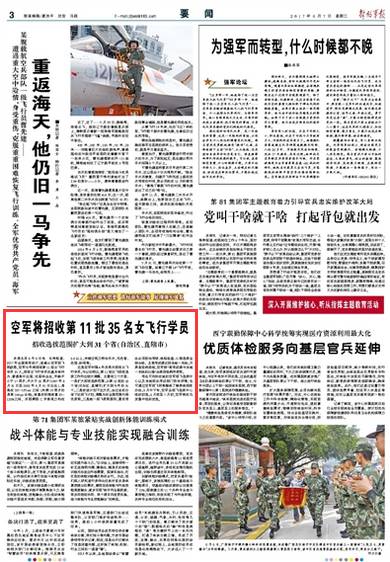 (本文刊于《解放軍報》2017年6月7日 03版,原標題:空軍將招收第11批35名女飛行學員)