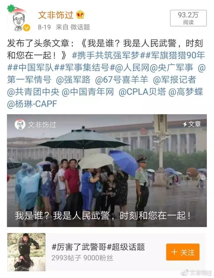 風雨來臨,天空門廣場執(zhí)勤的哨兵把頭上的雨傘讓給了身后的群眾,自己全身卻澆了個透。當天,這篇微博的閱讀量突破93萬。