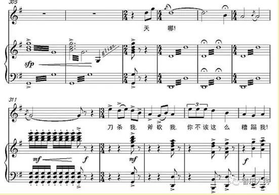 “刀殺我斧砍我,你不該這樣糟蹋我”這句是“曲首冠音”。音樂采用戲曲垛板。演唱者必須具備戲曲基本功,把幾個(gè)字,特別是“糟蹋我”三個(gè)字,用“噴口”噴出來,如此才能感染觀眾。我童年時(shí)演唱過山東梆子、河南豫劇,這些基本功派上了用場(chǎng)。采用演唱梆子的方法,把字咬住,用氣息推出,效果極佳,很有感染力。