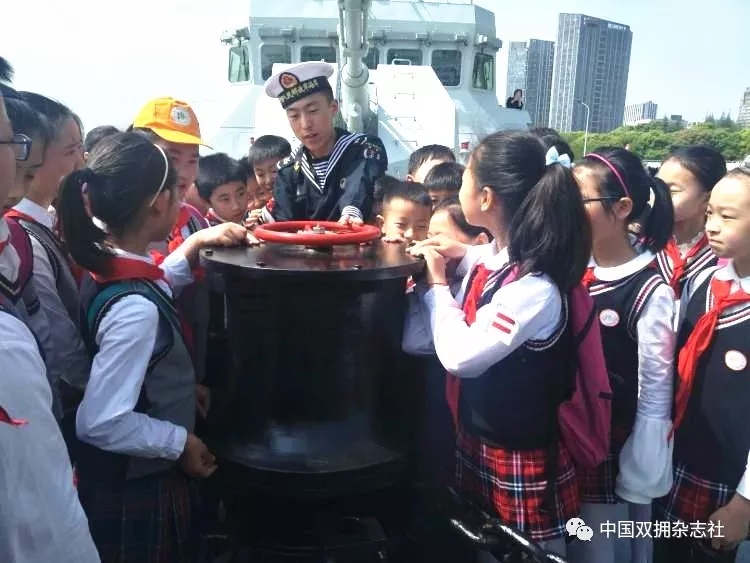 海軍戰(zhàn)士給參觀學(xué)生介紹軍艦裝備