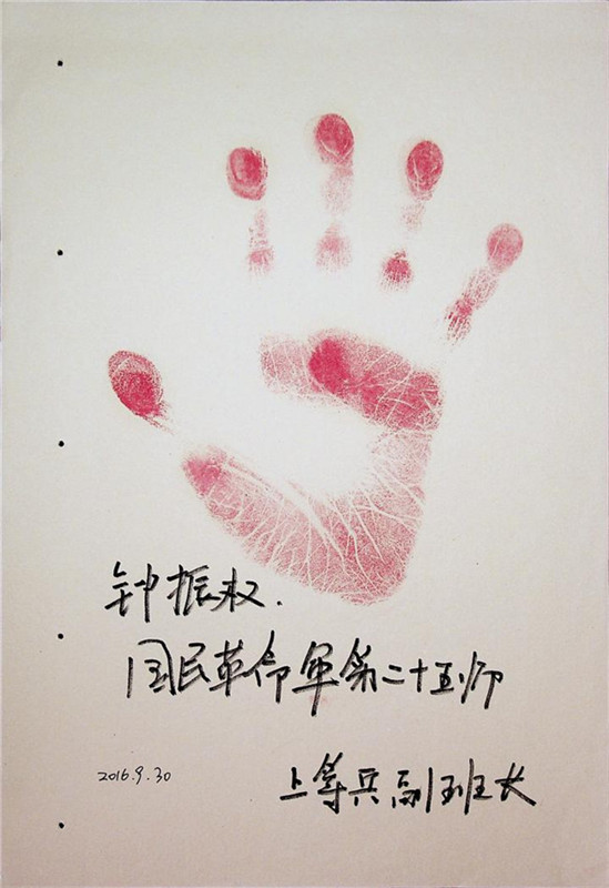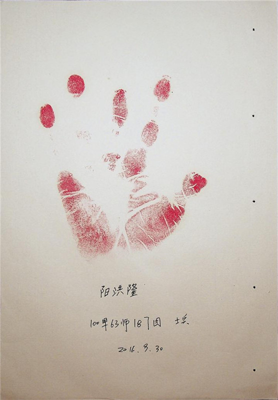 第100軍63師187團(tuán)士兵陽洪隆拓印的左手手印上,能夠清晰分辨出中指和大拇指都?xì)埲绷艘徊糠?這是陽洪隆老兵在當(dāng)年邵陽雪峰山保衛(wèi)戰(zhàn)中負(fù)傷所致。