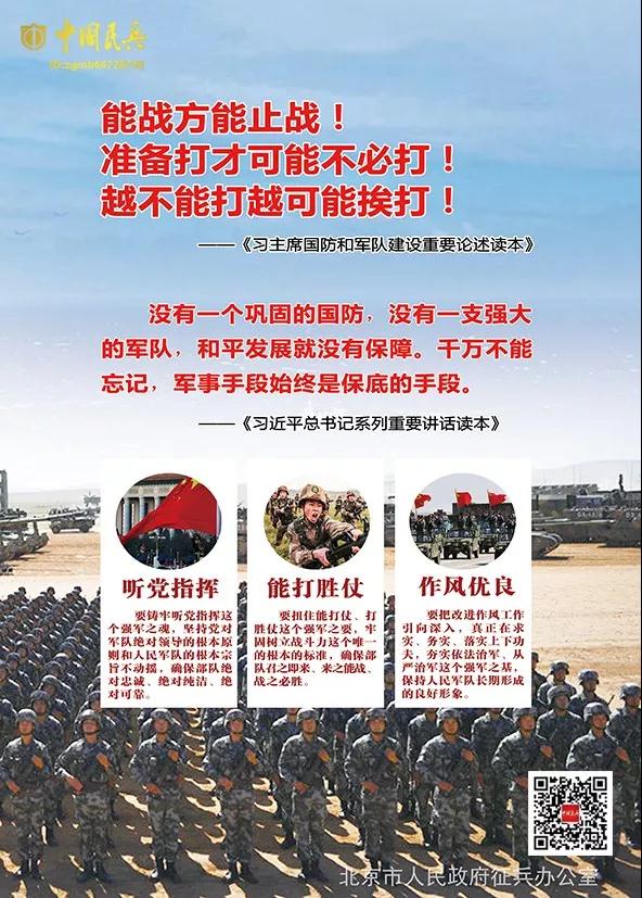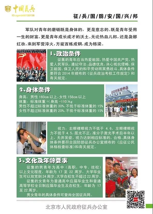 上周,中國民兵微信公眾號連續(xù)推出《北京征兵優(yōu)待政策有調整》、《2019年北京市大學生征兵工作啟動》等重磅文章,引起廣大有志青年的熱烈反響;今天,經北京市人民政府征兵辦公室授權,現公布最新最全征兵手冊!一冊在手,征兵資料全都有!還等什么,趕緊一睹為快吧!