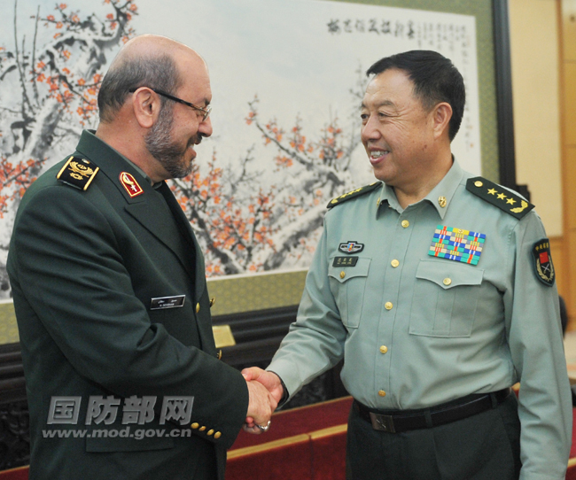 5月7日上午,中央軍委副主席范長(zhǎng)龍上將在八一大樓會(huì)見來華訪問的伊朗國(guó)防部長(zhǎng)德赫甘準(zhǔn)將。李曉偉攝