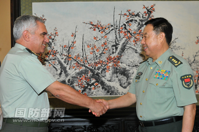 范長龍說,希臘歷史悠久,對人類文明進(jìn)步作出了特殊貢獻(xiàn)。中希兩國雖地理距離遙遠(yuǎn),但兩國人民之間的友誼源遠(yuǎn)流長。不久前,李克強(qiáng)總理成功訪希,雙方發(fā)表《中希關(guān)于進(jìn)一步深化全面戰(zhàn)略伙伴關(guān)系的聯(lián)合聲明》,為中希友好關(guān)系進(jìn)一步發(fā)展注入新的活力。隨著兩國關(guān)系的順利發(fā)展,中希兩軍關(guān)系得到不斷加強(qiáng),各領(lǐng)域務(wù)實(shí)合作成效顯著。中方愿與希方共同努力,推動中希兩軍友好合作關(guān)系向著多領(lǐng)域、多層次的方向發(fā)展。