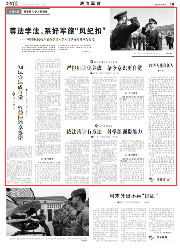 新學(xué)期,入學(xué)的新學(xué)員對(duì)“軍旅第一步”既滿懷欣喜與期待,也因環(huán)境陌生存有模糊認(rèn)識(shí),加之成長(zhǎng)背景不同、身心素質(zhì)不一,各級(jí)必須盡快引導(dǎo)他們完成向合格軍人的轉(zhuǎn)變。新學(xué)員入學(xué)入伍訓(xùn)練是軍事人才培養(yǎng)的奠基環(huán)節(jié),必須強(qiáng)化“學(xué)之初”的法治淬煉,提升新學(xué)員法治思維和法治素養(yǎng),為強(qiáng)軍興軍筑牢人才根基。
