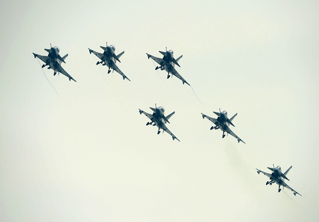 11月11日,女飛行員參與飛行的中國空軍八一飛行表演隊(duì)駕駛殲-10進(jìn)行飛行表演。沈玲 攝