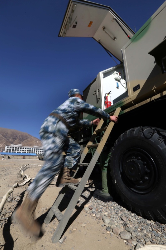 2月3日,西部戰(zhàn)區(qū)空軍地空導(dǎo)彈兵某部發(fā)射號手快速登上發(fā)射車為兵器加電。新華社發(fā)(劉暢 攝)