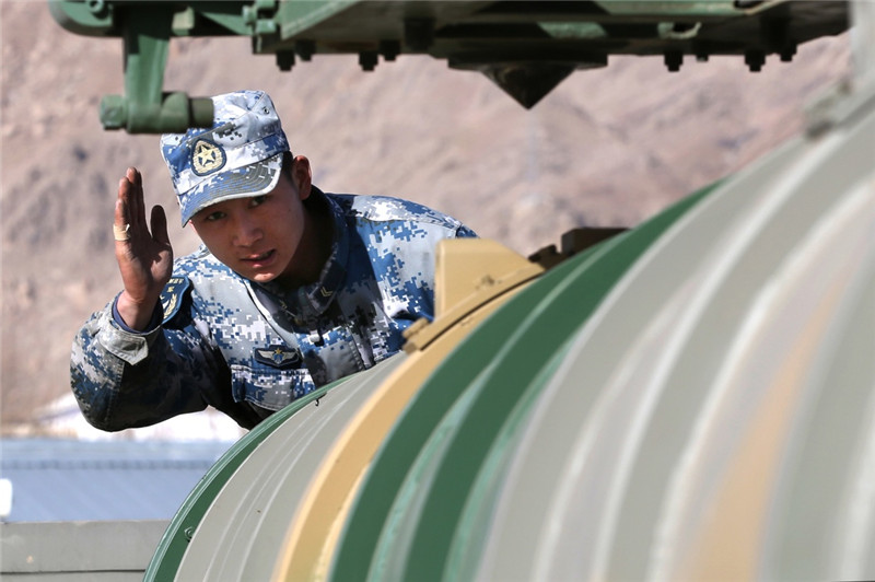 2月3日,西部戰(zhàn)區(qū)空軍地空導(dǎo)彈兵某部裝填號手快速吊裝導(dǎo)彈。新華社發(fā)(劉暢 攝)