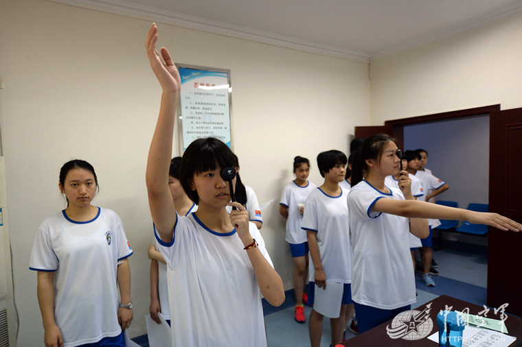 參加定選檢測(cè)的女學(xué)生們進(jìn)行視力檢測(cè)。余紅春攝