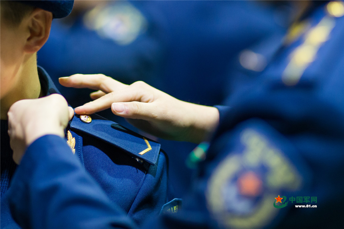 連長細(xì)心地為戰(zhàn)士佩戴肩章。