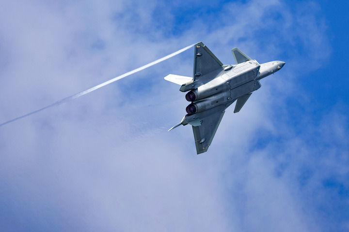↑9月19日,殲-20進(jìn)行飛行表演。新華社發(fā)(譚巳成 攝)