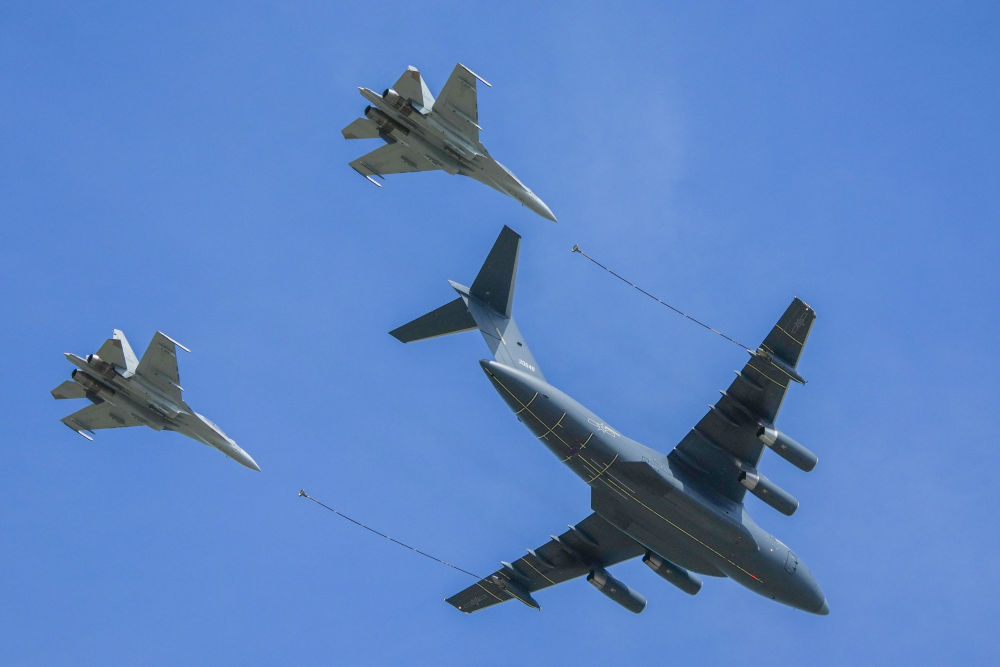 ↑9月19日,運油-20A和殲-16編隊通場。新華社記者 顏麟蘊 攝