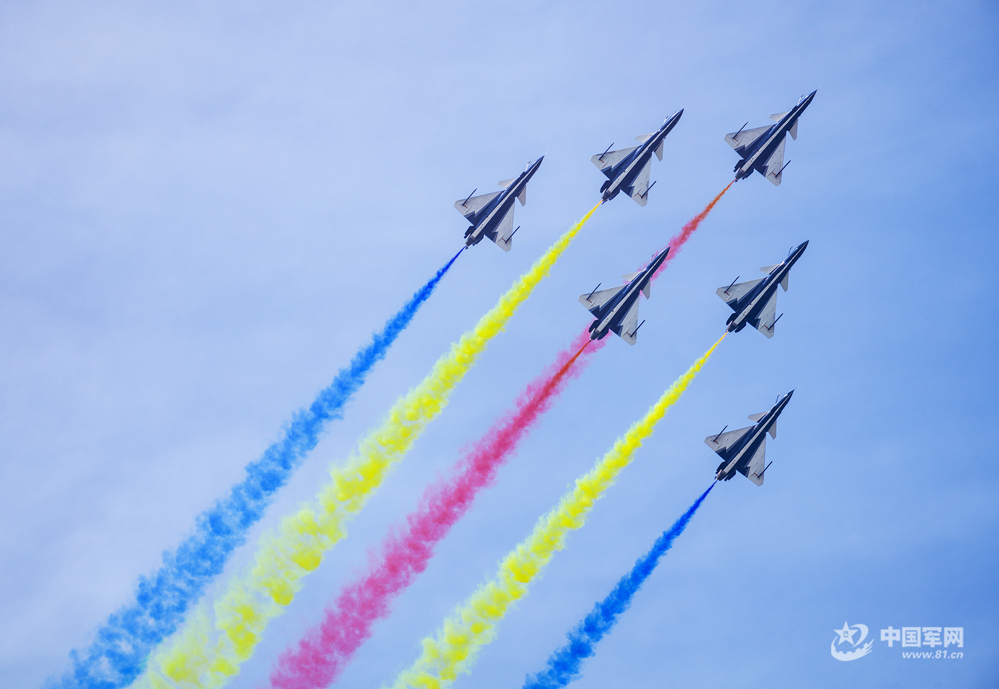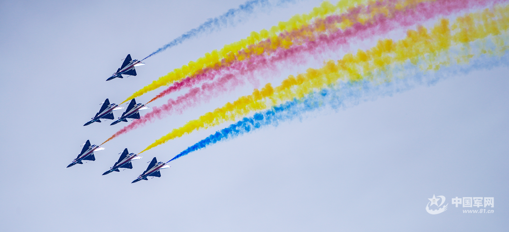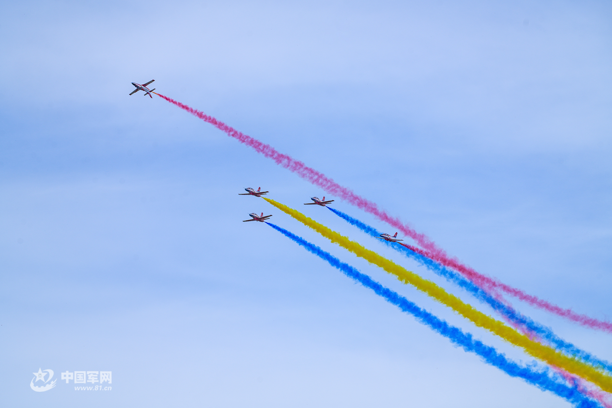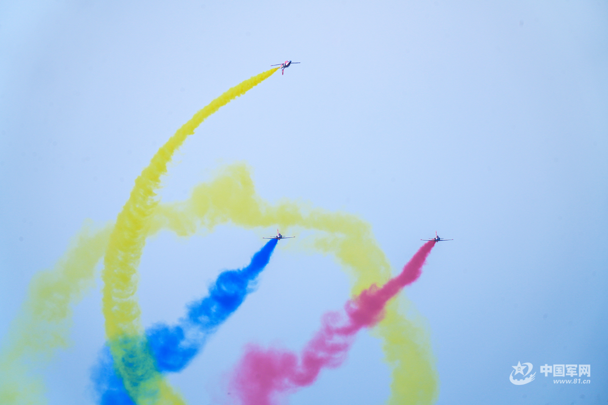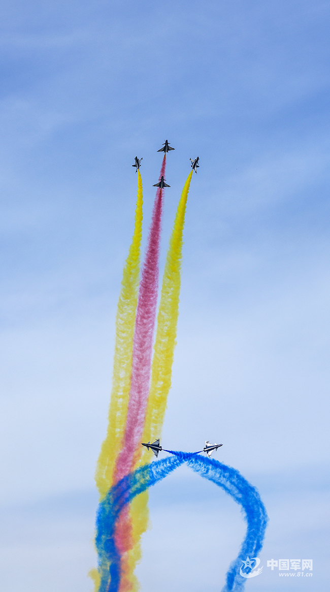 八一飛行表演隊紅黃藍彩煙劃過天際