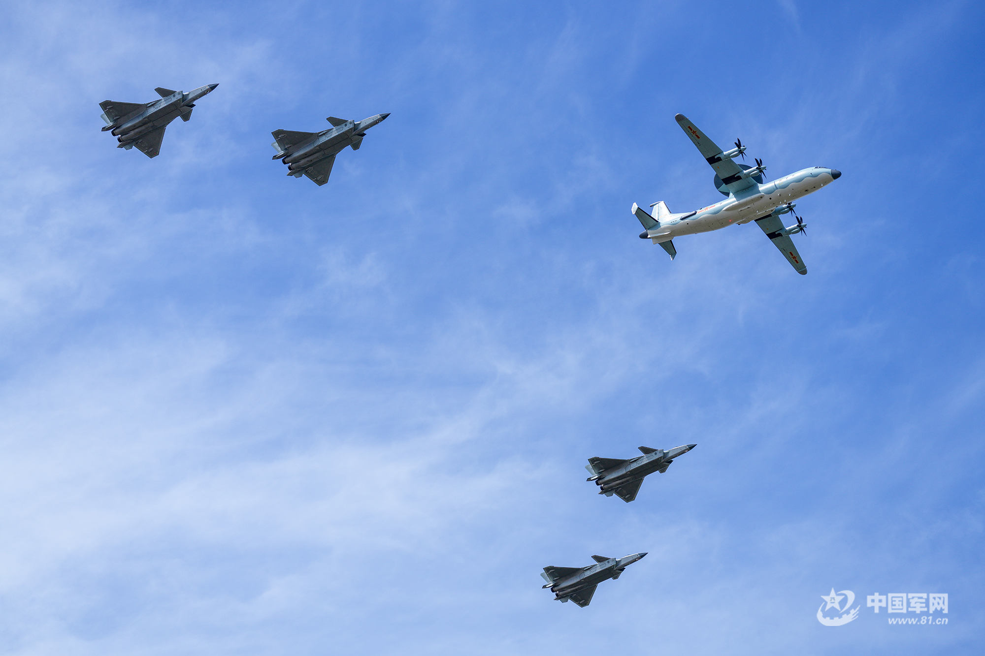 空警-500單機和殲-20四機護航編隊