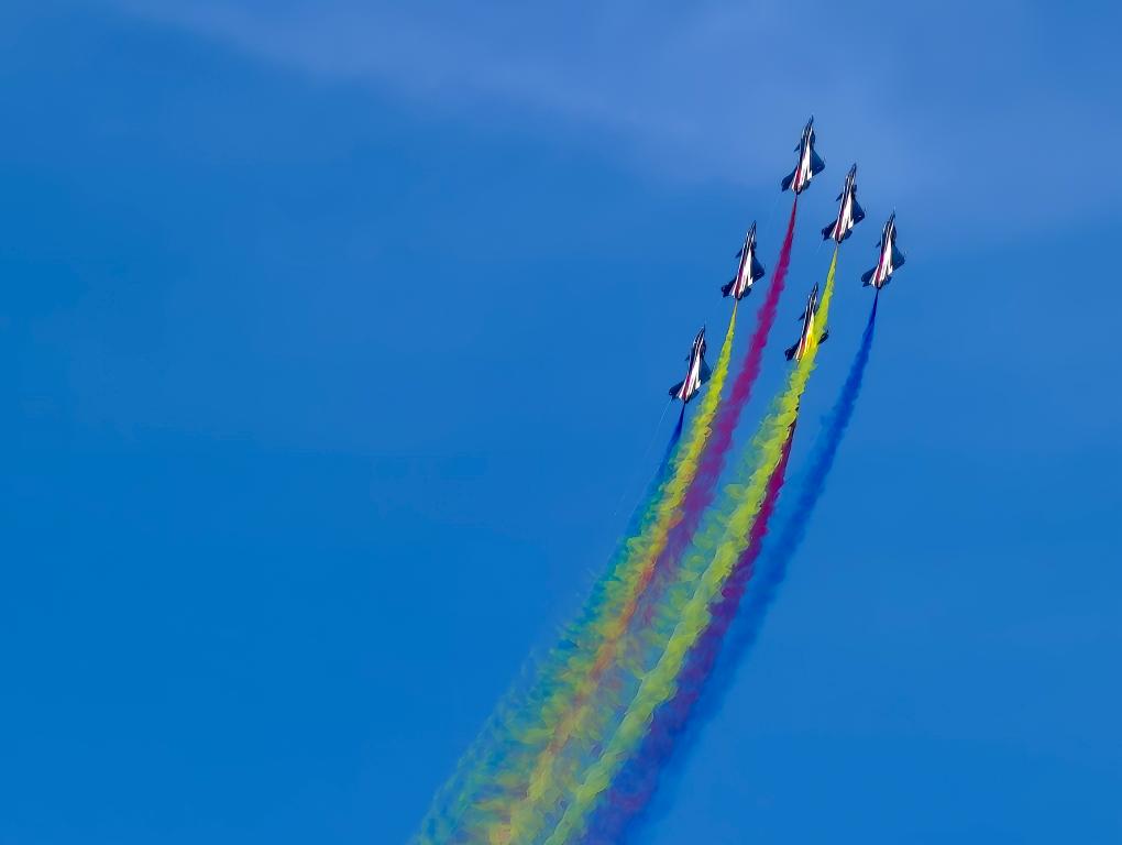 轟鳴聲由遠(yuǎn)及近,空軍八一飛行表演隊(duì)在白云間“畫(huà)出”的絢麗“彩旗”,仿佛訴說(shuō)著:藍(lán)天之上,中國(guó)人正在書(shū)寫(xiě)新的傳奇。(記者宋晨)