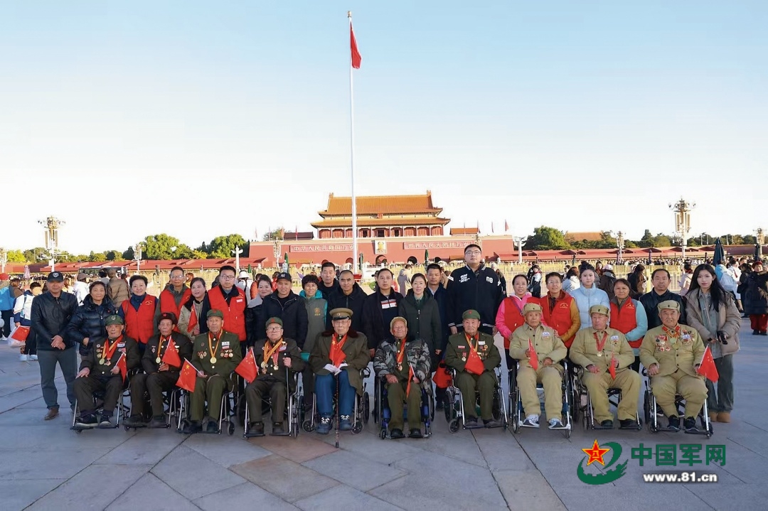 臨別時(shí)分,老兵們紛紛在國(guó)旗下、城樓前合影。他們的身影與巍峨的城樓、飄揚(yáng)的國(guó)旗,共同定格為一幅幅動(dòng)人畫(huà)卷。