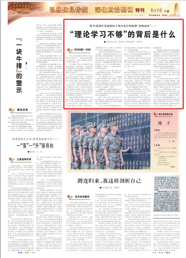 短短一周內(nèi),全旅干部自查自糾不再“躲躲閃閃”,而是直指群眾觀念出現(xiàn)偏差、政績觀出現(xiàn)偏差、擔(dān)當(dāng)意識(shí)出現(xiàn)偏差等3類“思想病灶”——