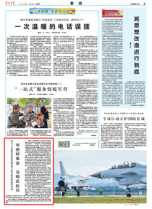 “邀請兄弟單位的精武標兵、先進典型來隊分享奮斗故事,是我們破解教育資源不足、教育形式創(chuàng)新乏力等現(xiàn)實難題的有效舉措。”該旅領(lǐng)導介紹,他們結(jié)合野外駐訓、重大節(jié)日、新兵入伍等時機,探索推出“我與標兵面對面”教育活動,通過組織聯(lián)合授課、事跡報告、戰(zhàn)例研討等形式,邀請友鄰軍兵種單位的優(yōu)秀官兵來隊,同憶紅色傳統(tǒng)、共學奮斗故事,推動思想政治教育走深走實。