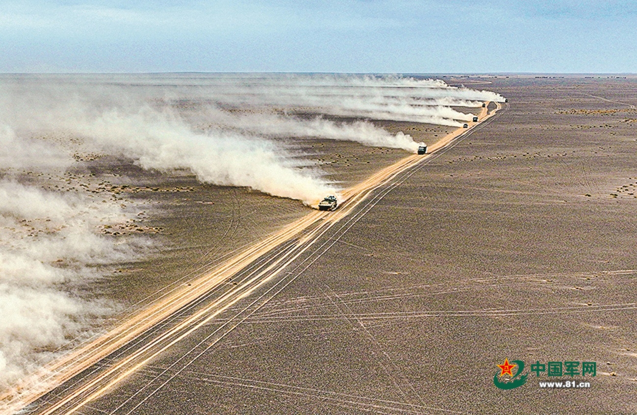隨著數(shù)枚信號(hào)彈呼嘯升空,訓(xùn)練拉開帷幕。戰(zhàn)車編隊(duì)向目標(biāo)地域疾馳而去,一路卷起滾滾塵煙。