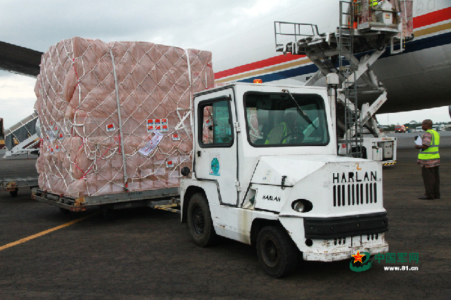 中國維和運輸分隊為利比里亞搶運防疫醫(yī)療物資