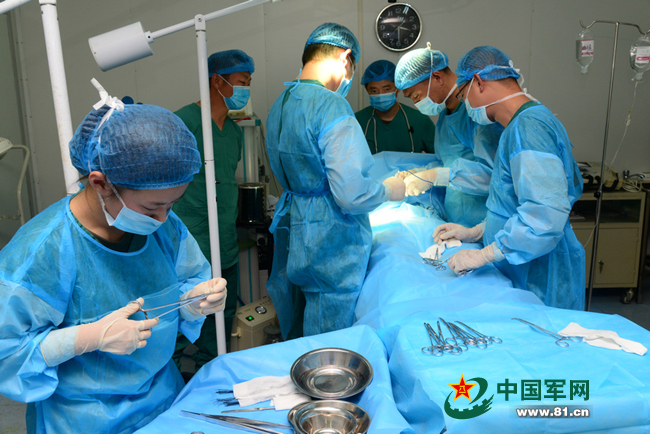 據(jù)醫(yī)療隊隊長李健介紹,10月31日晚,柬埔寨營患者納倫恩因腹痛加重緊急送到醫(yī)院。B超結(jié)果顯示,患者闌尾腫脹達1.0厘米,實驗檢查結(jié)果顯示,患者白細(xì)胞達1.9萬/毫升,體溫39℃,確診為急性闌尾炎。因患者病情嚴(yán)重,醫(yī)療隊立即組織手術(shù)。在手術(shù)中,因患者闌尾周圍粘連嚴(yán)重,并且已經(jīng)化膿,醫(yī)務(wù)人員為患者吸凈膿液、分離粘連、結(jié)扎切斷闌尾系膜并切除闌尾。1小時后,手術(shù)順利完成。