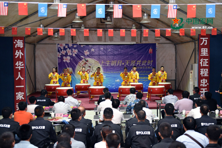 防暴隊員以一曲《擊鼓迎賓》拉開了文藝晚會的序幕,陣陣鼓聲中,平時習慣了握槍的手敲起鼓來更加顯示力量與美的結(jié)合。李金良 攝