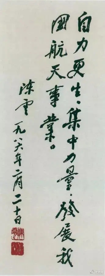 1986年2月20日,陳云為祝賀我國第三顆通訊衛(wèi)星發(fā)射成功給國防科工委題詞。