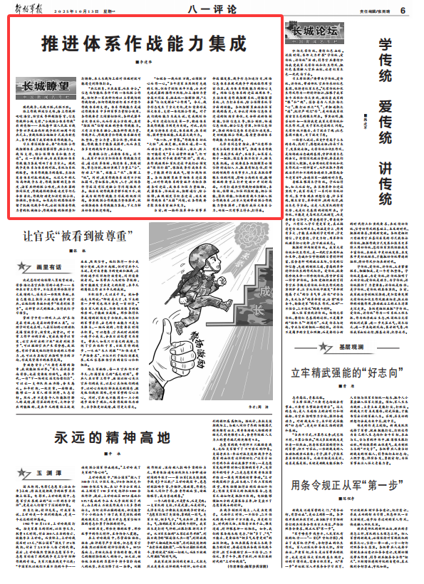戰(zhàn)要聯(lián)合打,兵要體系練。近年來,我軍十分注重加強(qiáng)體系作戰(zhàn)能力建設(shè),通過改革體制、構(gòu)建體系、實(shí)戰(zhàn)訓(xùn)練、常態(tài)演訓(xùn),較好實(shí)現(xiàn)了力量上“合”、行動上“聯(lián)”、效能上“優(yōu)”、指揮上“統(tǒng)”。同時,我軍作戰(zhàn)體系還有不少短板弱項(xiàng),譬如裝備、戰(zhàn)場、人才、訓(xùn)練條件等還沒有深度融合等問題依然存在。倘若關(guān)鍵作戰(zhàn)要素鑼齊鼓不齊,就會成為制約作戰(zhàn)能力形成的瓶頸問題。要實(shí)現(xiàn)聯(lián)合作戰(zhàn)能力整體提升,就必須推進(jìn)體系作戰(zhàn)能力集成,下大力解決好體系抓建難題。