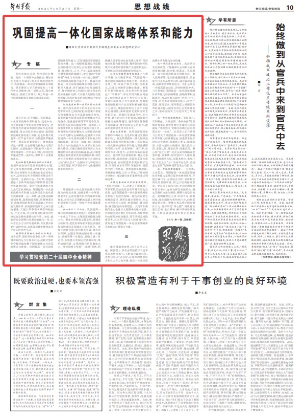 鞏固提高一體化國(guó)家戰(zhàn)略體系和能力的政治分量、戰(zhàn)略承載十分厚重,需要我們?nèi)姘盐掌淇茖W(xué)內(nèi)涵和實(shí)踐要求,在深化認(rèn)識(shí)理解的基礎(chǔ)上更好地把思想和行動(dòng)統(tǒng)一到黨中央決策部署上來(lái)。