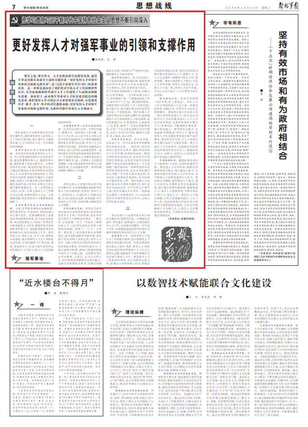 強軍之道,要在得人。人才是推動我軍高質量發(fā)展、贏得軍事競爭和未來戰(zhàn)爭主動的關鍵因素?!案冒l(fā)揮人才對強軍事業(yè)的引領和支撐作用”,是《習近平論強軍興軍(四)》的重要內容。這一重要論述深化了我們黨對軍隊人才工作的規(guī)律性認識,為全面加強新時代我軍人才工作提供了行動指南和根本遵循。新征程上,面對強軍事業(yè)對人才隊伍建設提出的現(xiàn)實需求,我們要深入學習領會習主席重要講話精神,自覺強化識才、聚才、育才、用才的責任感使命感,更好發(fā)揮人才對強軍事業(yè)的引領和支撐作用,為新時代強軍事業(yè)注入不竭動力。