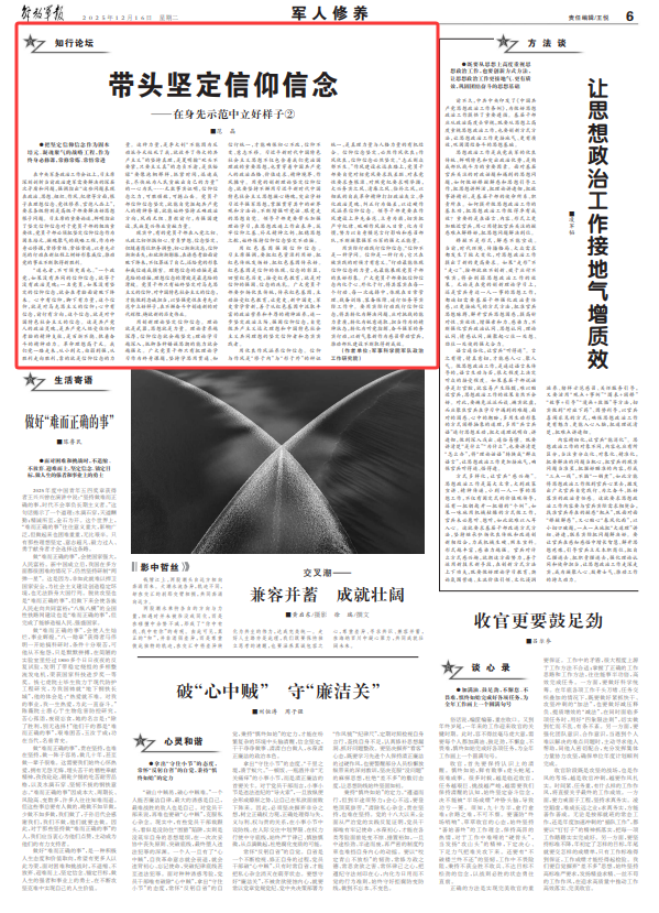 用優(yōu)良作風(fēng)涵養(yǎng)信仰信念。信仰與作風(fēng)是“修于內(nèi)”與“形于外”的辯證統(tǒng)一,是真理力量與人格力量的有機(jī)結(jié)合。信仰信念堅(jiān)定,必然作風(fēng)優(yōu)良;作風(fēng)優(yōu)良,信仰信念必然堅(jiān)定。“志正則眾邪不生?!弊黠L(fēng)建設(shè)永遠(yuǎn)在路上,黨員干部要自覺(jué)對(duì)標(biāo)黨風(fēng)要求找差距、對(duì)表黨性要求查根源、對(duì)照黨紀(jì)要求明舉措,大興務(wù)實(shí)之風(fēng)、清廉之風(fēng)、儉樸之風(fēng),以徹底的自我革命精神打掃政治灰塵、凈化政治靈魂、糾正行為偏差,以過(guò)硬作風(fēng)涵養(yǎng)信仰信念。領(lǐng)導(dǎo)干部更要在作風(fēng)建設(shè)上率先垂范、立身為旗,切實(shí)把嚴(yán)守紀(jì)律、砥礪作風(fēng)融入日常、化為習(xí)慣,努力以自身模范言行影響和感召部隊(duì),不斷凝聚強(qiáng)軍興軍的強(qiáng)大正能量。