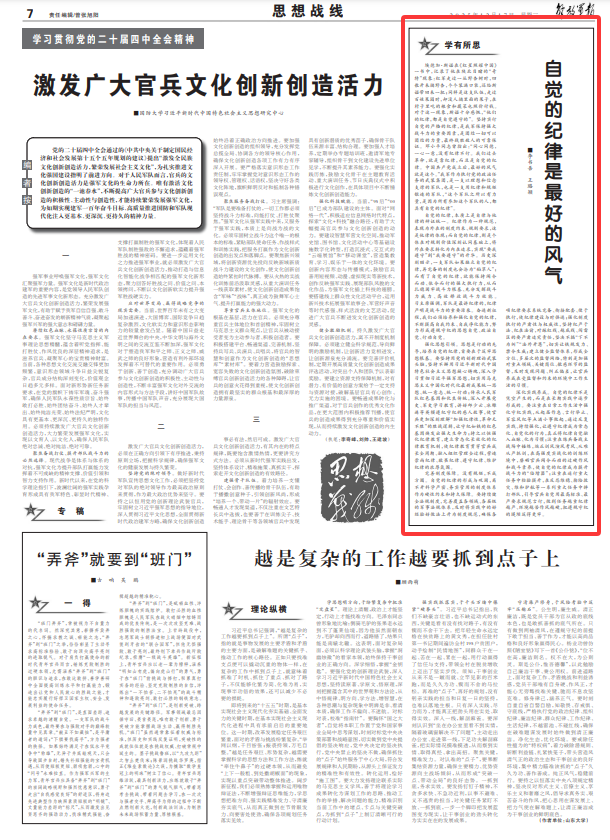 強化思想引領。思想是行動的先導,培養(yǎng)自覺的紀律,首要在于筑牢思想根基。要堅持用黨的創(chuàng)新理論武裝頭腦,堅持不懈用習近平新時代中國特色社會主義思想凝心鑄魂,深入學習貫徹習近平強軍思想,切實用馬克思主義中國化時代化最新成果統(tǒng)一思想、統(tǒng)一意志、統(tǒng)一行動;傳承人民軍隊紅色基因和優(yōu)良傳統(tǒng),深入開展黨史、軍史學習教育,講好邱少云、冰雕連等英模遵紀守紀的感人故事,使官兵更加深刻理解“加強紀律性,革命無不勝”的勝戰(zhàn)邏輯,讓守紀如鐵的紅色基因煥發(fā)出強大生命力;持之以恒強化紀律教育,建立常態(tài)化長效化的紀律教育機制,使紀律教育貫穿官兵成長全周期、融入組織管理全過程,營造崇尚紀律、敬畏紀律、遵守紀律、維護紀律的濃厚氛圍。