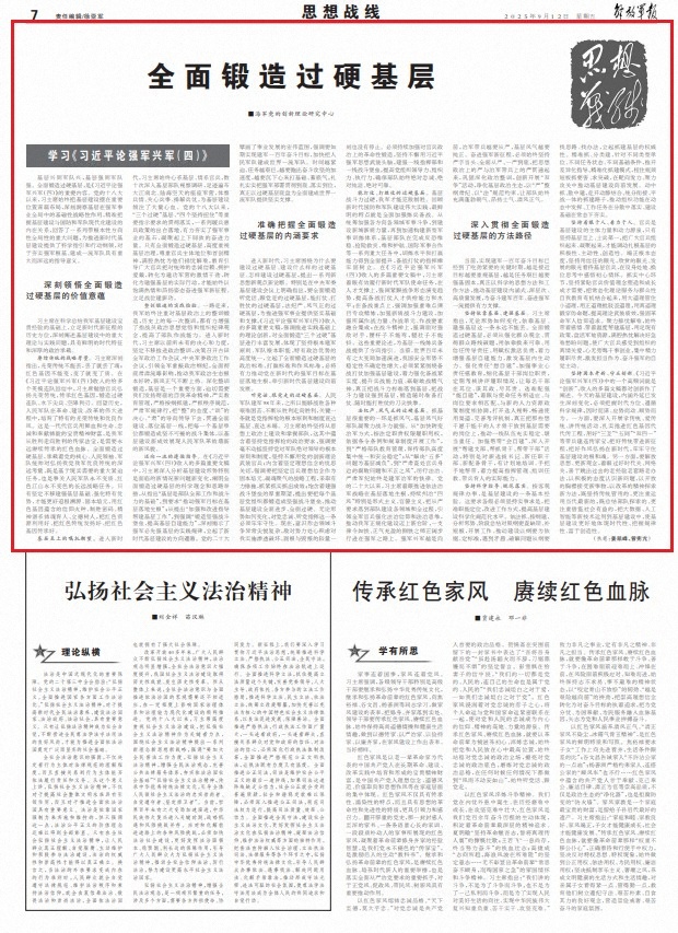 基層興則軍隊興,基層強則軍隊強。全面鍛造過硬基層,是《習近平論強軍興軍(四)》的重要內(nèi)容。黨的十八大以來,習主席始終把基層建設擺在重要位置謀篇布局,深刻洞察基層在強軍事業(yè)全局中的基礎性戰(zhàn)略性作用,精準把握基層建設與國防和軍隊現(xiàn)代化建設的內(nèi)在關系,回答了一系列帶根本性方向性全局性的重大問題,為推進新時代基層建設提供了科學指引和行動綱領,對于夯實強軍根基、建成一流軍隊具有重大而深遠的指導意義。
