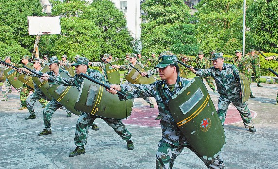 寧明縣民兵在開展警棍盾牌使用科目訓(xùn)練。