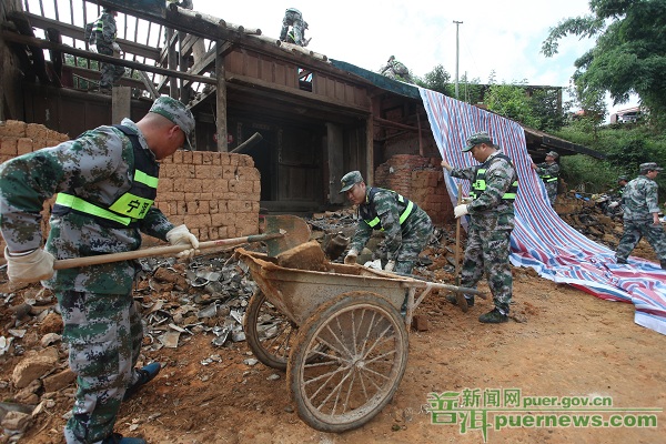 在景谷“10·07”地震中,景谷縣永平鎮(zhèn)芒費(fèi)村一組的李學(xué)榮家受災(zāi)嚴(yán)重,他家的大兒子在福建武警部隊(duì)服役,家里的勞動(dòng)力只有李學(xué)榮一人,生活陷入困境。得知這一情況后,正在永平參與搶險(xiǎn)救援的寧洱縣民兵隊(duì)伍來(lái)到李學(xué)榮家,幫他家修補(bǔ)圍墻,并在屋頂鋪蓋篷布,減輕他家的一些損失,也讓李學(xué)榮的兒子在部隊(duì)能安心服役。