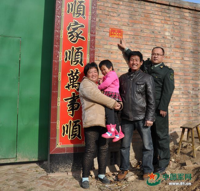 新兵何雨軒的父母在“光榮軍屬”牌前合影