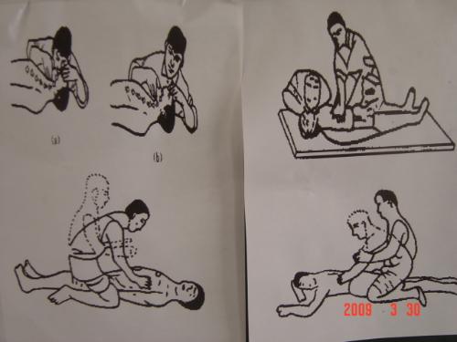 ●溺水者是否要倒水,應(yīng)視具體情況而定。無呼吸道阻塞者可不必倒水。倒水時要盡量縮短倒水時間,以能倒出口、咽及氣管內(nèi)的水為度,以免影響其他更重要的搶救措施。