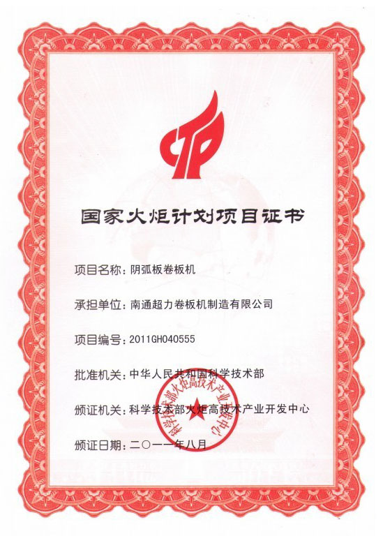 今年2月,南通超力卷板機(jī)制造有限公司正式接受到國(guó)家科技部頒發(fā)的“陰弧板卷板機(jī)”火炬計(jì)劃項(xiàng)目證書(shū)。至此,該火炬計(jì)劃項(xiàng)目正式立項(xiàng)。