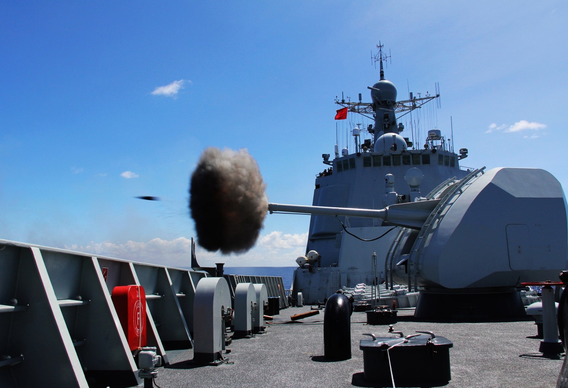 在多國聯(lián)演任務(wù)中,??谂炦M(jìn)行主炮射擊(2014年6月19日攝)。新華社發(fā)(于林攝)