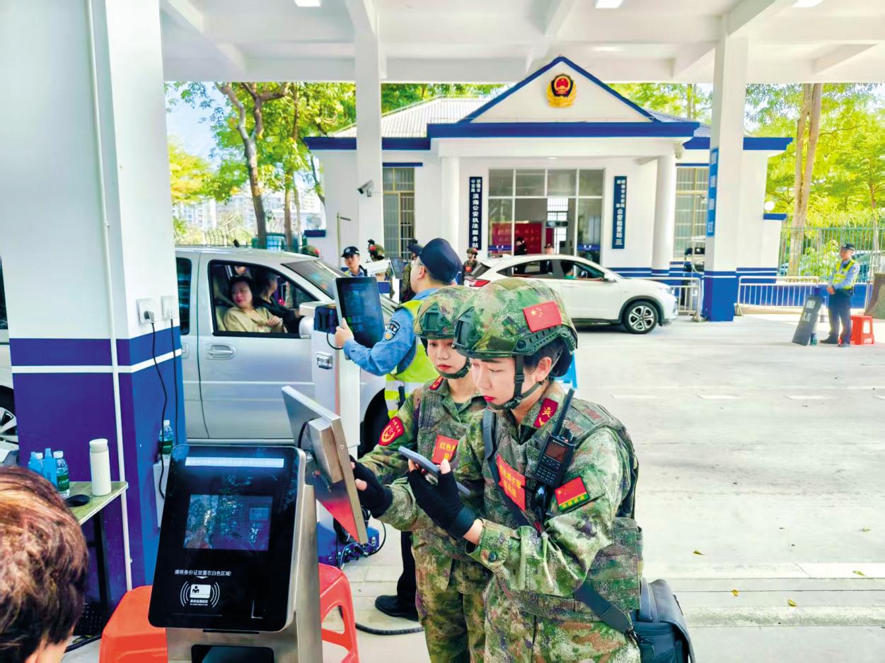 紅色娘子軍民兵連女民兵在博鰲亞洲論壇2025年年會舉行期間對過往車輛進行安檢。